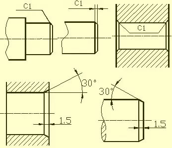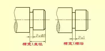 车削外圆时的退刀槽,其尺寸一般可按"槽宽×直径"或"槽宽×槽深"方式标注。磨削外圆或磨削外圆和端面时的砂轮越程槽。