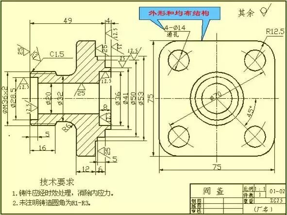 如图中所示就增加了一个左视图,以表达带圆角的方形凸缘和四个均布的通孔。