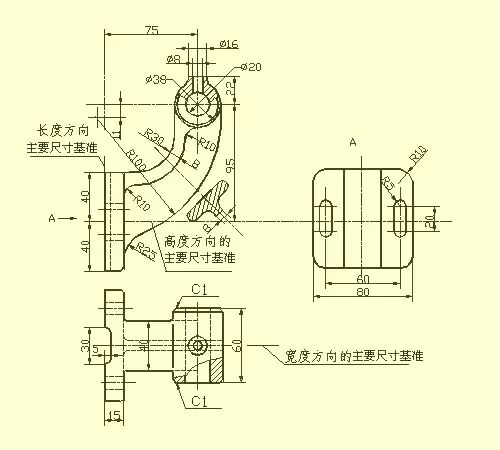 在标注叉架类零件的尺寸时,通常选用安装基面或零件的对称面作为尺寸基准。尺寸标注方法参见图。