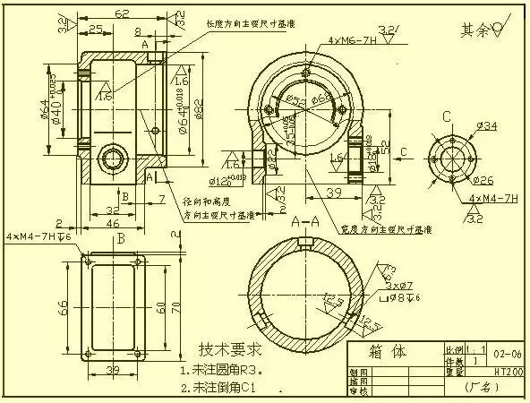 在标注尺寸方面,通常选用设计上要求的轴线、重要的安装面、接触面(或加工面)、箱体某些主要结构的对称面(宽度、长度)等作为尺寸基准。