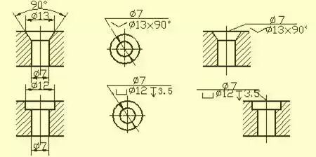 常见孔的尺寸注法(盲孔、螺纹孔、沉孔、锪平孔)倒角的尺寸注法。