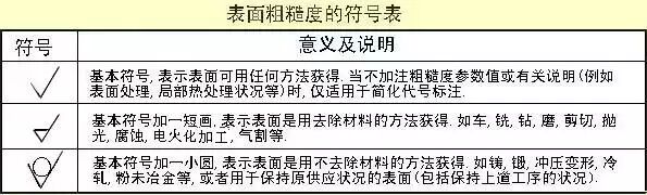 GB/T 131-1993规定了表面粗糙度代号及其注法。图样上表示零件表面粗糙度的符号见下表。