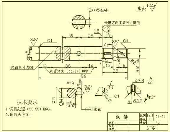 再以右轴端为长度方向的辅助基,从而标注出轴的总长96。