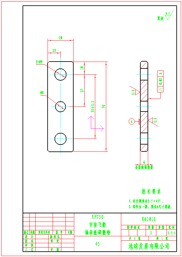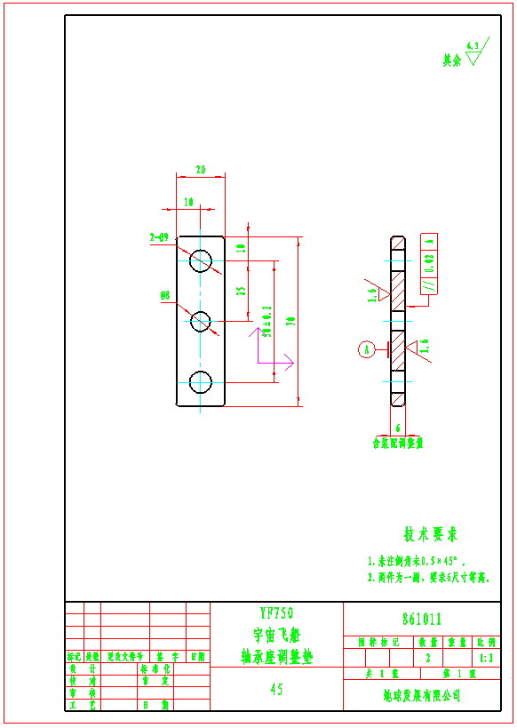 我们拿上图来举例,这个零件是属于什么产品(宇宙飞船),它的产品型号是什么(YF750),它叫什么名称(轴承座调整垫),材料是什么(45号钢),零件图号是什么(861011),数量要做多少件(2件),图纸比例(1.2:1,这个问题稍后我会详细讲),所在公司(地球发展有限公司)。