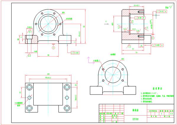 3、我们首先选取轴承座与支承大件的结合面来做基准,因为这个基准便于加工的划线和基准面的初加工,同时这个也是我们装配过程中的基准面,所以以这个面为基准是非常合适的。