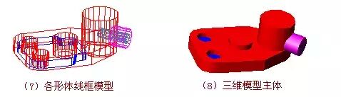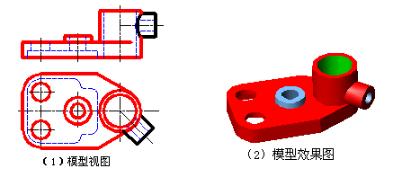 按以上步骤绘制出各形体后就可进行布尔运算,最后再绘制并减出底板上的凸台孔和右圆柱体空心孔,该模型的效果如图四十七(2)所示。