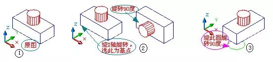 注意:实体绕X、Y、Z轴旋转是指方向,具体轴的位置由用户选择一基准点确定。