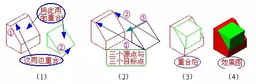 在二维中是选两个实体的两对对应点编辑,在三维编辑中只需选两个实体的三对对应点即可。