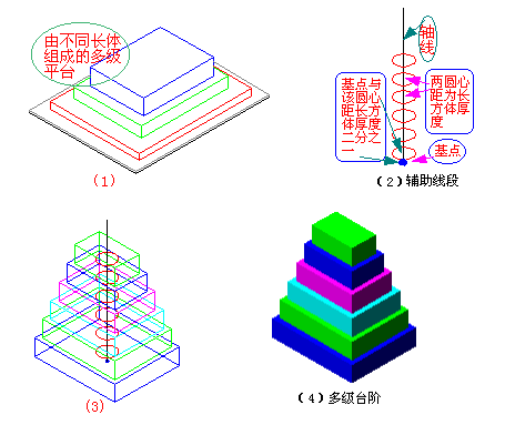 如图三十九(1)所示,要绘制一多级台阶的基座,随意的绘制将很难控制每层长方体的缩放系数。