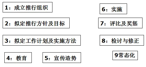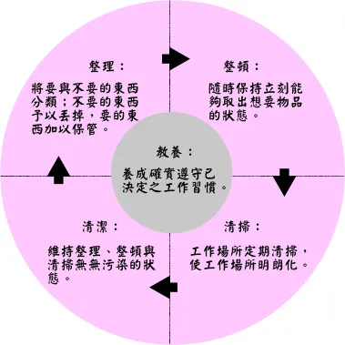 建立清扫责任区(室内外);执行例行扫除,清理脏污;执行例行污染源,予以杜绝;建立清扫基准,作为规范。