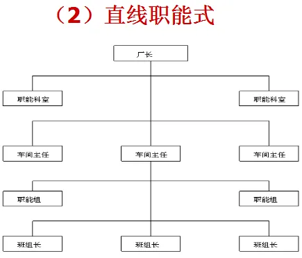 1、生产现场组织,是公司的最基层组织,其组织结构一般有三种,即直线式、职能式和直线职能式。