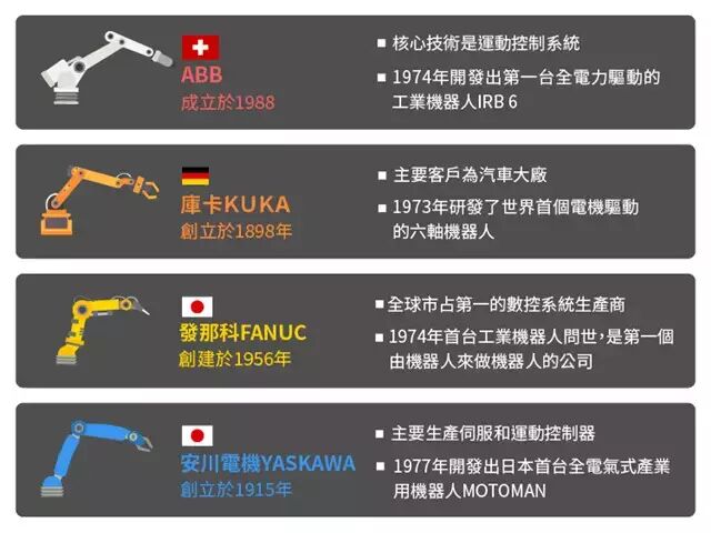 它们在亚洲市场同样也是举足轻重,更占据中国机器人产业70%以上的市场份额,几乎垄断了机器人制造、焊接等高阶领域。下面我们来揭开这四大家族的神秘面纱吧。