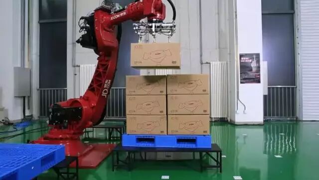 京东也有类似Kiva的AGV搬运机器人,利用地上贴着的二维码来导航,用来搬运货物。另外,京东还使用了六轴机械臂来进行货物的分拣。