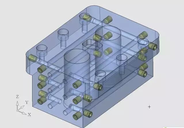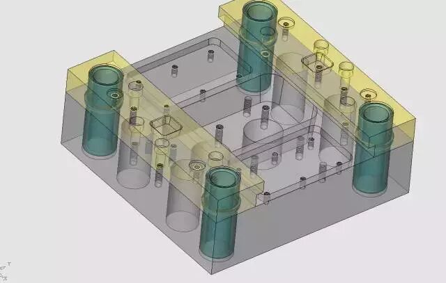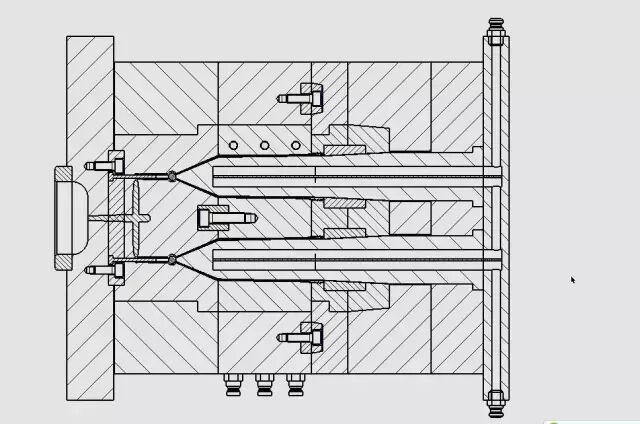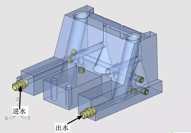 定模仁的设计是非常传统的,没有什么特殊的地方,从上图可以看到,有分成三层的冷却水路。