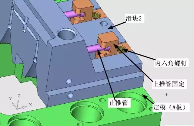 图中,止推管是固定在定模上的,相对于产品是不动的。而滑块2 镶针是固定在滑块2 上的,是随着滑块2 运动的。
