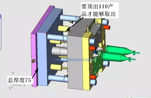这个医用滴液器产品比较长,有效的顶出距离要110mm,产品才能够顺利地取出,可是设置限位螺丝的空间才50mm,(底板+型芯板-螺丝头-台阶厚度)。