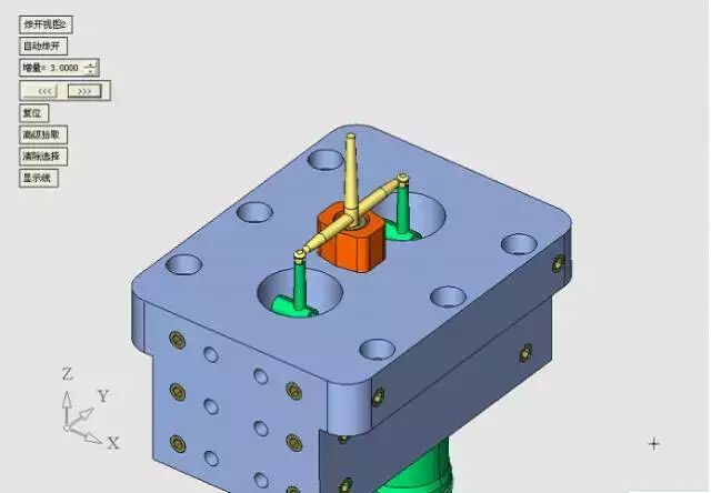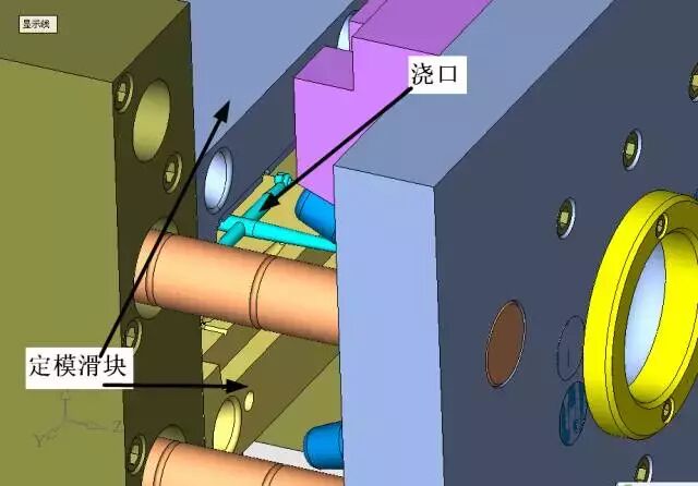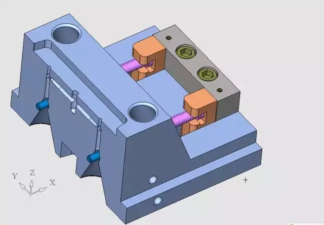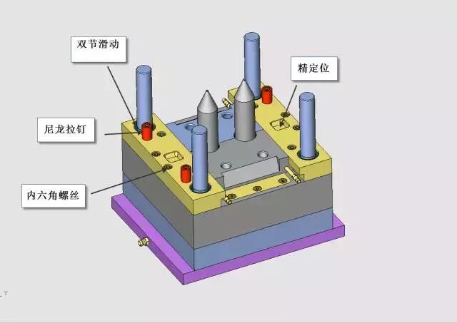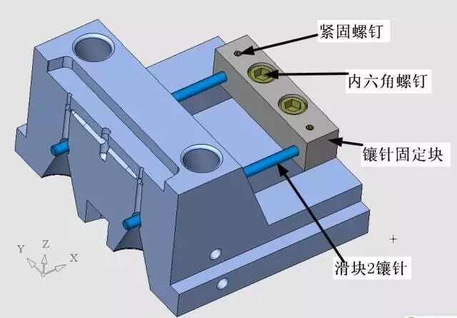 这个定位机构我是这样设计的,非常简单的结构,但是它起到了定模滑块与定模仁的精确定位作用,同时也使得定模滑块1、定模滑块2之间产生精确定位,见下图。