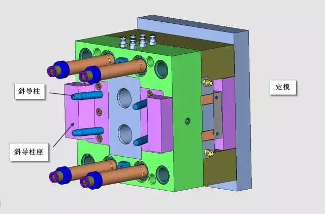 滑块拨开的动力是靠固定在定模一侧的斜导柱作上的斜导柱来实现的,见下图。