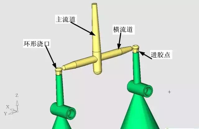 这个爪形浇口在出模时是与横流道断开的,并会连在产品上,以后有一道切浇口的工艺,并且要做一个专门的切断工具,这看起来好像很麻烦,但是我认为,要得到合格的产品,这是必须的。