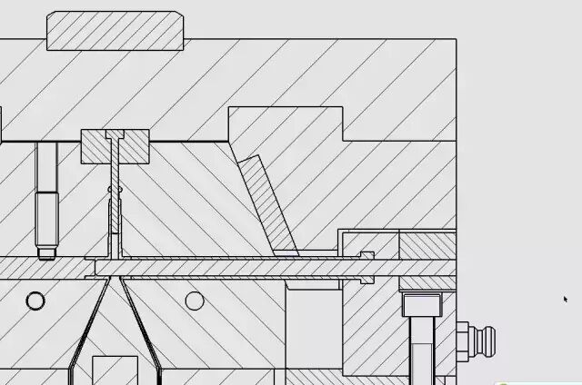 一般的模具设计师在滑块的外侧都是采用斜面,但是我在这里留了一点点平面,这样做的好处是没有增加加工成本,但是有了这个平面,火花机加工的时候非常方便,另外水接头可以做在这个平面上,避免了在斜面上攻螺纹的麻烦。