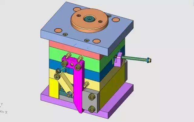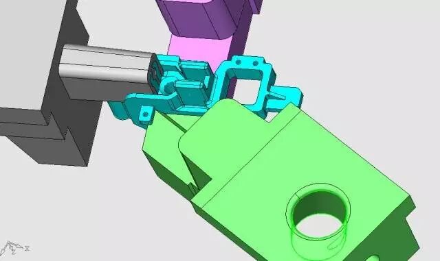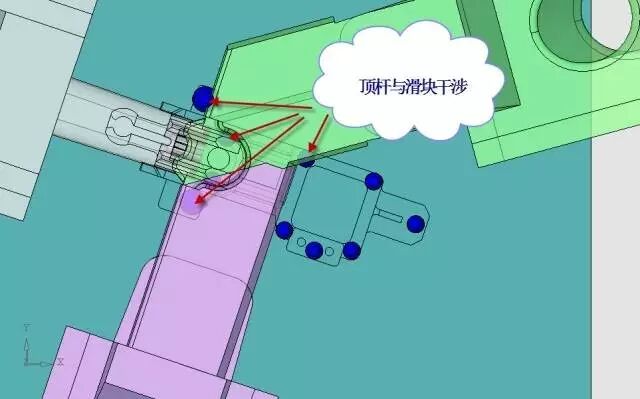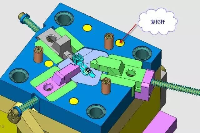 由于有5支顶杆与滑块是干涉的,必须设置先复位结构,见图25。