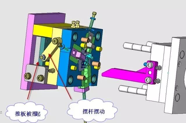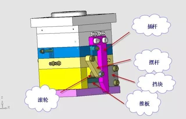 先复位机构又称预复位机构,它由插杆、摆杆、滚轮、挡块4大件组成。开模时,斜导柱将滑块全部拨开,见图27。