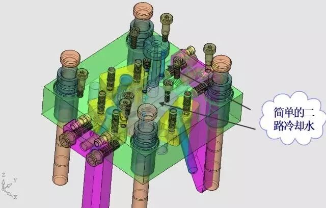 由于制品比较小,而且注塑的间隙要放镶件(铜片),所以注塑的周期比较长,所以这套模具的冷却水路的要求不高,我采用了最简化的设计,由于模仁比较小,水是直接从模板上走的。定模是2条直通的水路,见图30。