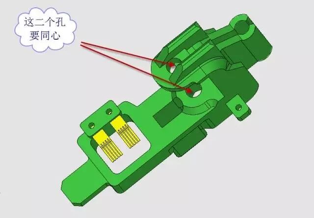 本产品的上下二个孔的不同心度是在0.02mm以下的,由于POM(聚甲醛)的制品易产生变形,所以为了最大限度地减少制品的内应力,进胶点的位置的选定在模具设计时是要全面考虑的,而且上下二孔在出模后要进行定型处理,见图2。