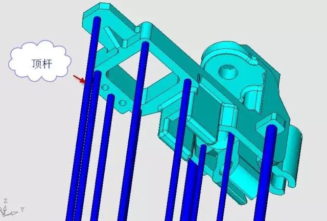 拉断浇口的力是依靠上图中的3个尼龙拉钉,为了使得复位的力比较平衡,复位杆的位置也是经过精心布置的。