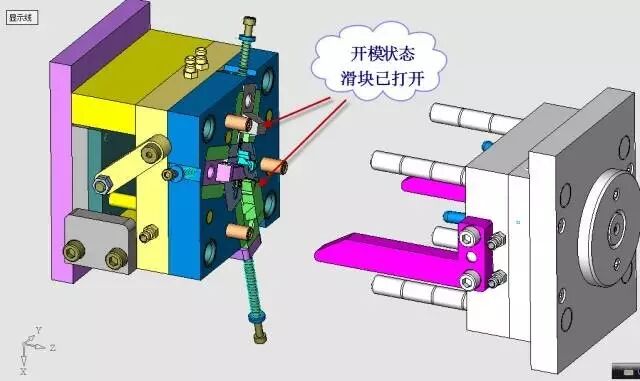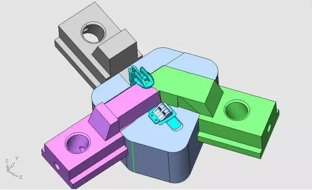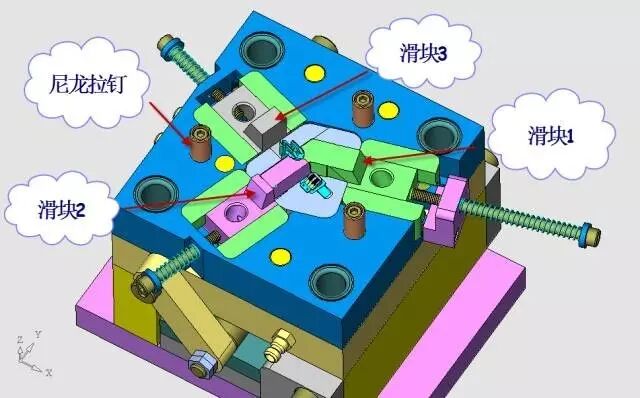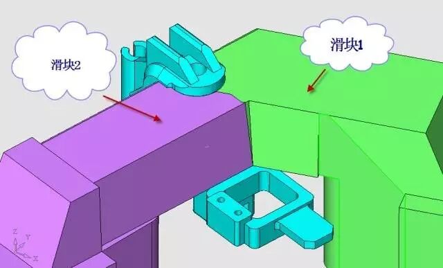 这套模具的设计要点是滑块1和滑块2的边界的安排以及进胶点的位置的选择。
