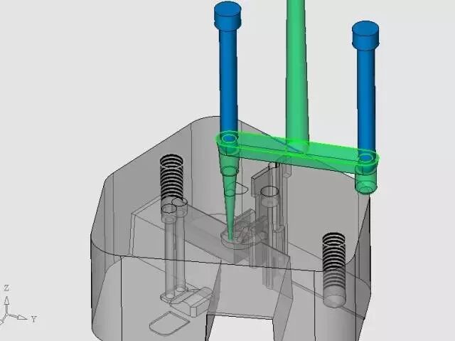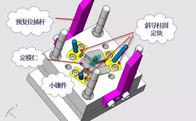滑块的动力来源是3个斜导柱通过注塑机开模的力将滑块拨开,斜导柱是利用斜导柱固定块固定在定模板上的。定模侧设置有先复位结构的插杆,见图21。