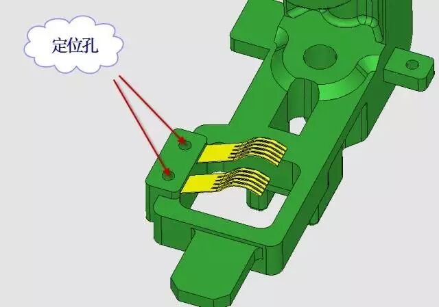 为了防止铜片在注塑时不被塑料冲偏,铜片上设置了二个小孔,在模具中设置了相应的型芯将其定位,见图6。
