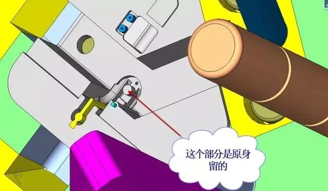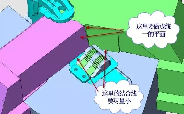 由于滑块1和滑块2以及它们的共同边界是封胶面,所以这里要处理成统一的平面,并要有拔模斜度,于定模成插穿配合。而且配合面要做的非常精准,使得产品表面的结合线尽量地小,见图18。