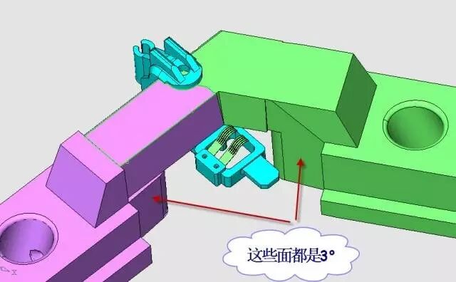 滑块3的端面是与动模仁碰穿的,以形成封胶位,伸进模仁的配合面在运动方向是有3°斜度的,以确保滑块在长期工作时不会由于摩擦而拉毛。