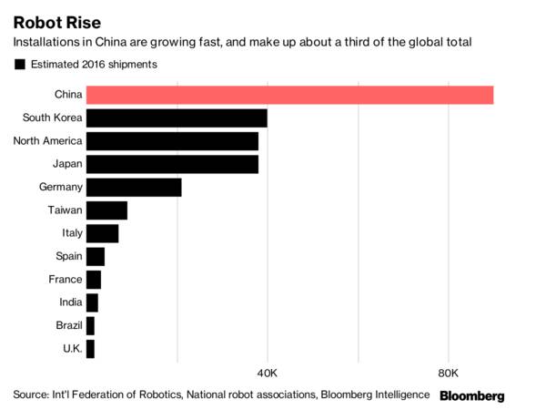 据国际航运联合会估计,去年中国的机器人出货量猛增了27%,几乎占到全球总量的三分之一,预计到2019年这一数字将攀升至16万台。中国政府还希望在国内110亿美元的机器人市场份额中增加中国品牌的份额,目标是从去年的31%增加到2020的50%以上,并在2020年每年生产10万台机器人。